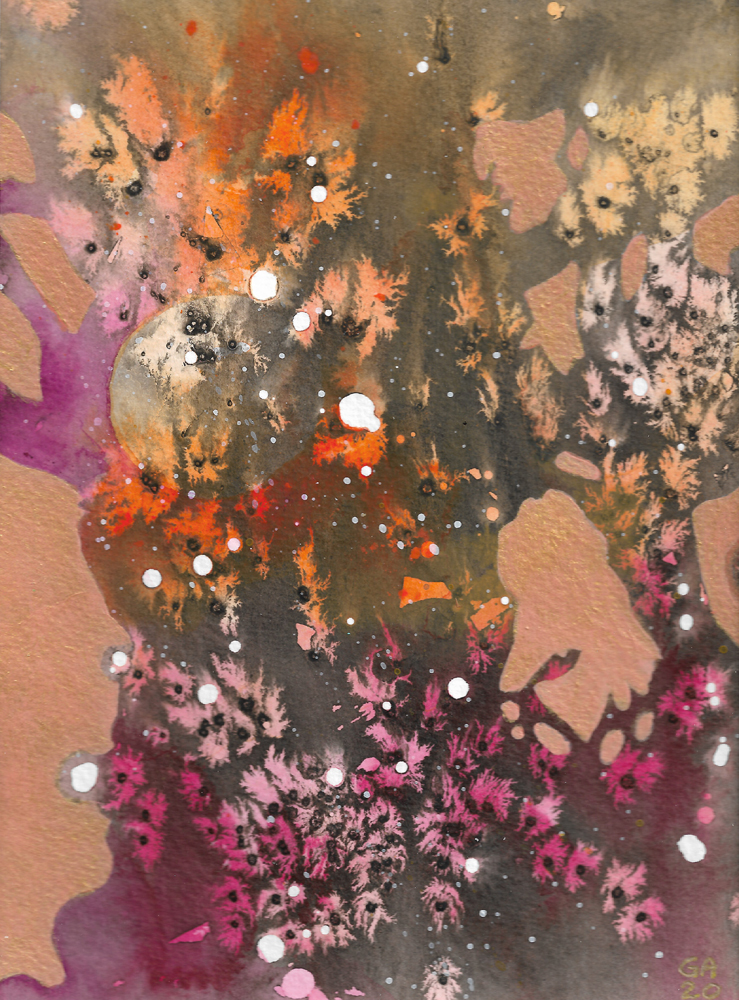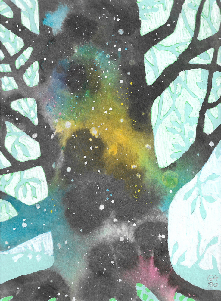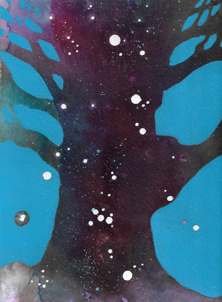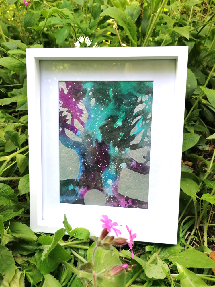 The Cosmic Tree series was created in 2020 using acrylics and inks on watercolour paper. Each painting will be posted flat and mounted, ready for you to place in your favourite frame. (Frames in photos are for reference only). Each mounted artwork measures 20×25.5 cm.